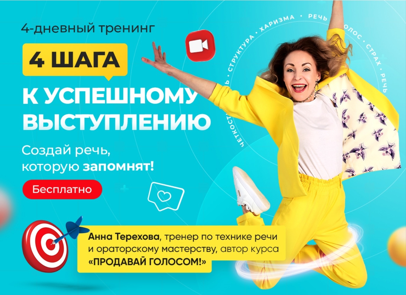 Чтобы понять, насколько мощно работают речевые техники и получить первые результаты, я приглашаю вас на БЕСПЛАТНЫЙ 4х дневный тренинг «4 ШАГА к УСПЕШНОМУ ВЫСТУПЛЕНИЮ!»